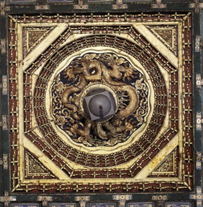 這個是故宮紫禁城,寶座上邊叫做藻井。井字形的,也是這個形狀,也是覆斗行的。中間這個鏡子,我們也講這叫軒轅鏡。軒轅鏡,有六個,互相組成木字行,華字像,華胥像。軒轅鏡,一目了然,大家看的很清楚,這是封建時代,到清朝,發展到頂峰,它形成這個建筑,寶座上邊就要有軒轅鏡,來鑒別真假天子的,也是皇權的象征。這是方圓, 方圓。