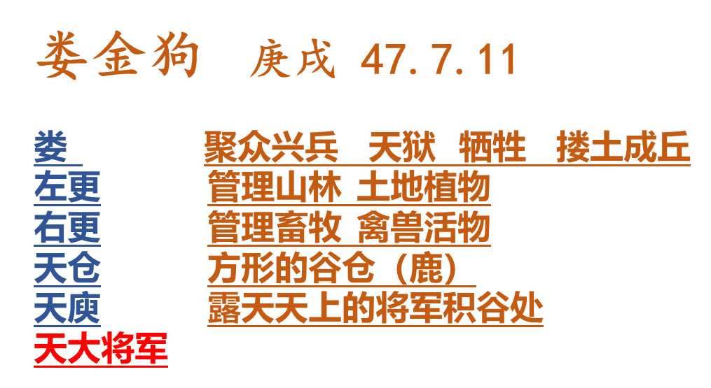 婁金狗是婁宿,是二十八宿里的,就是西王七宿的。婁宿有六個星官,第一個就是婁,婁宿三,它是白羊座。這個婁宿只要的職能是干什么?第一個是聚眾。婁星這個亮,就是要造反了,要興兵造反。叫聚眾,聚在一起干什么?當然要興兵了。