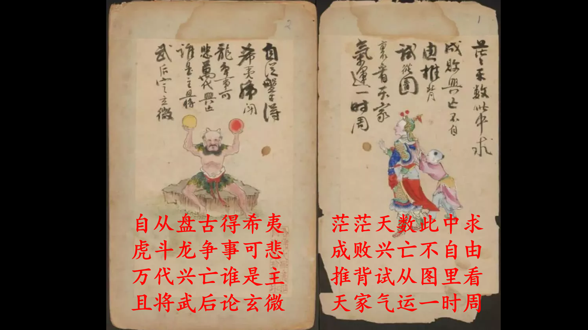 所以這道士呢,這個東方人呢,手里拿著木頭,這叫相。是文的。西邊的,這個將軍戴著劍,就是武將。然后東西相對將相相對。東方青龍,是綠色的,木色,是木的,是木頭。西邊是金,金是白的。就是金和木相對。然后東方青龍,西方白虎。龍和虎相對,所以這個,“虎斗龍爭事可悲”,有的叫“虎斗龍爭事正奇”。這就非常形象的解釋了,這個《推背圖》是怎么作的。始終,始終,始就是終,終就是始。始終結合,東西結合,將相結合,金木結合,虎斗龍爭。這個事就成了。中間是大道,一塊走的大道。