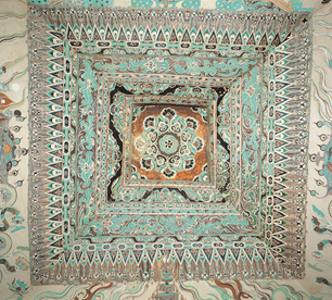這是敦煌藏經洞,敦煌這個藏經洞,這個經都在這個洞窟里,這個洞窟的頂上,都是這個覆斗形。這上邊的圖案,大家可以看清楚,去敦煌的朋友可能看到,所有的洞窟都是這個樣子。所以敦煌這個圖,這個藻井圖案,就是這個斗形,花樣繁多,有各種各樣的圖冊。敦煌藻井圖案,特別的漂亮。這是藏經的。