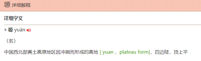 這是后來這個字了,這個塬字,其實不是早期的字,這個字后期才有的,之前沒有這個土字旁。一般都是中間這個原。塬,《辭海》,《詞源》上解釋,中國西北部,黃土高原上,印沖刷而形成的高地,四邊陡,頂上平,其實就是金字塔的形狀。
