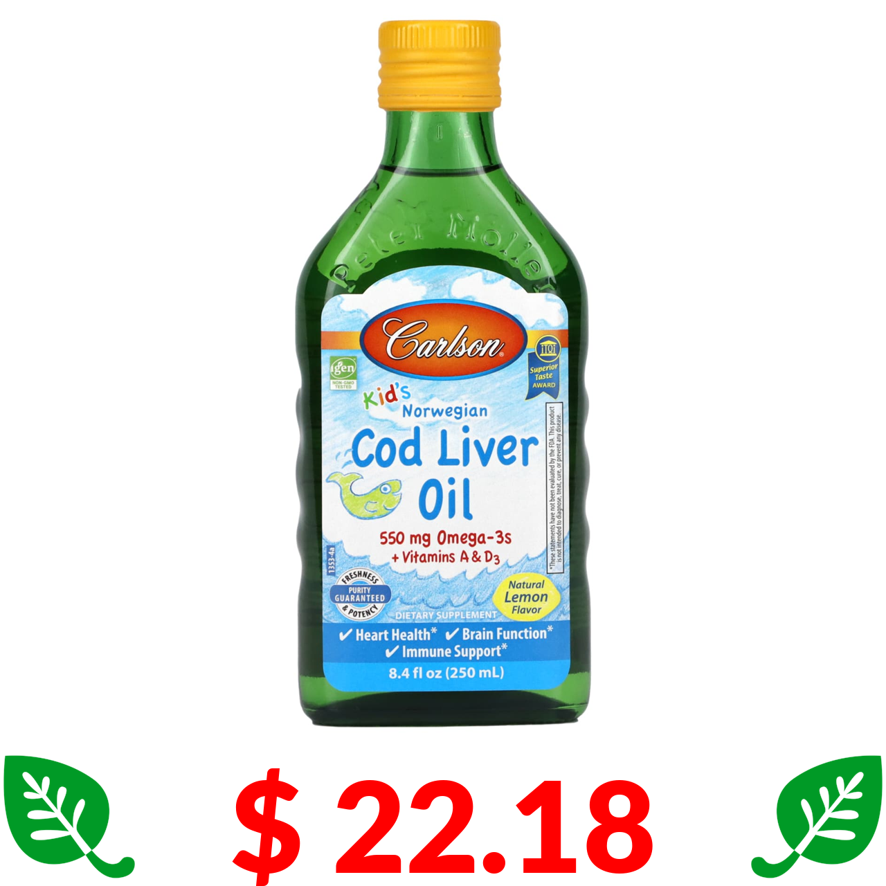 $ 22.18 Carlson, олія з печінки норвезької тріски, для дітей, з натуральним лимонним смаком, 250 мл (8,4 рідк.унції)