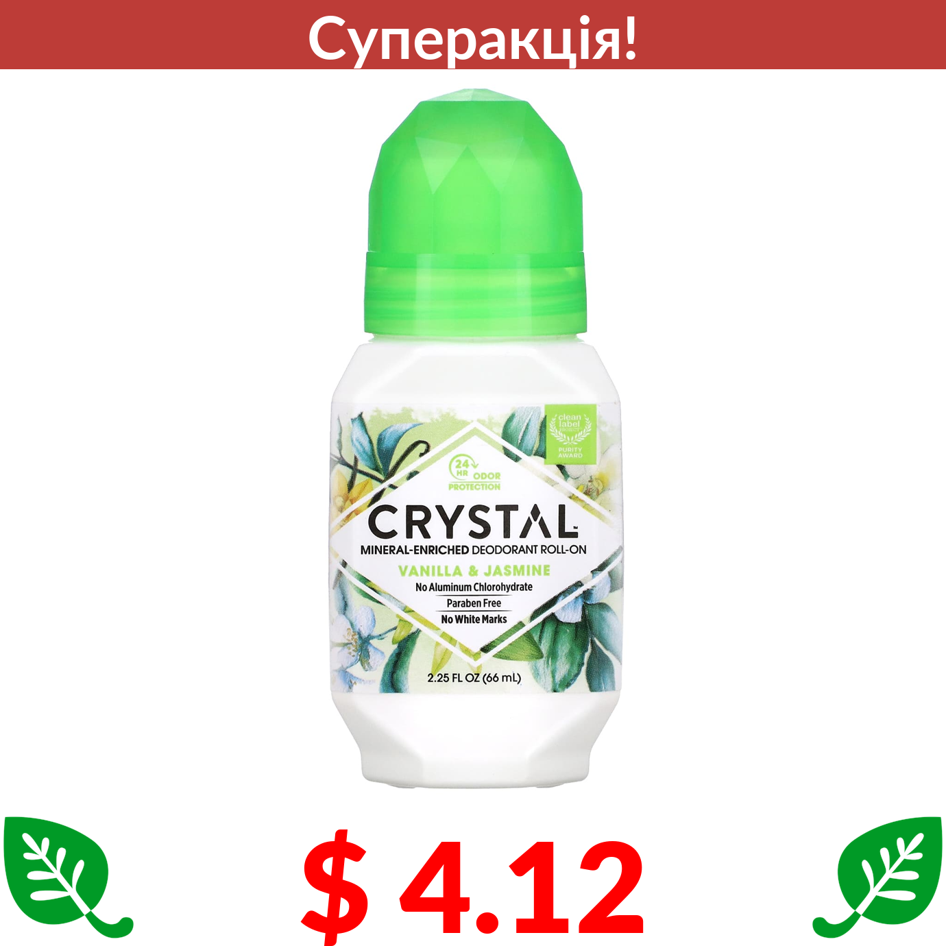 $ 4.12 Crystal Body Deodorant, натуральний дезодорант з кульковим аплікатором, ваніль і жасмин, 66 мл (2,25 рідк. унції)