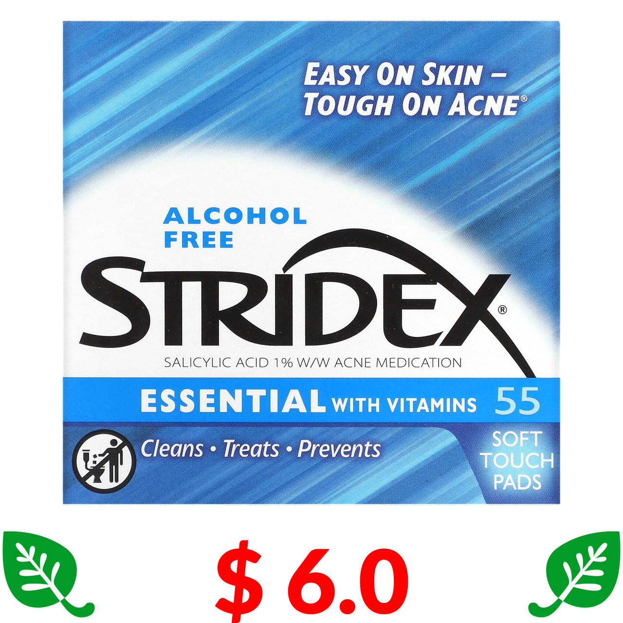 $ 6.0 Stridex, Single-Step, контроль акне, без спирту, 55 м’яких подушечок, 4,21 в кожному