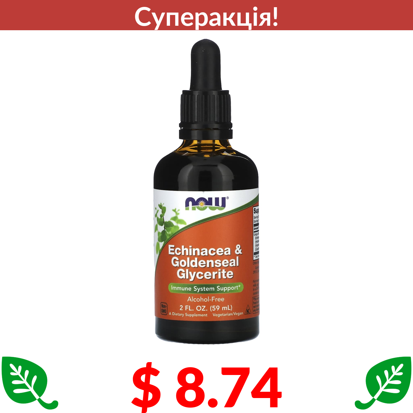 $ 8.74 Now Foods, гліцерит із ехінацеї та жовтокореня, без спирту, 59 мл (2 рідк. унції)