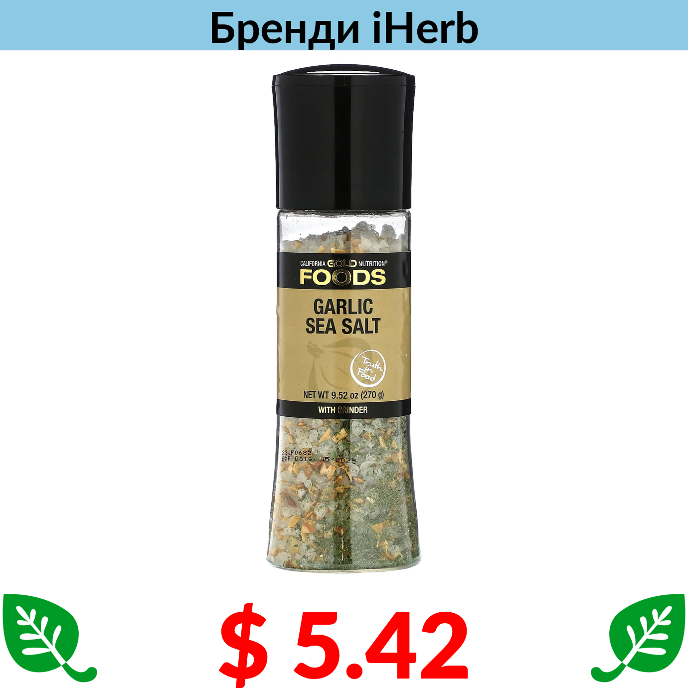 $ 5.42 California Gold Nutrition, FOODS, часник, морська сіль у млинку, 270 г (9,52 унції)