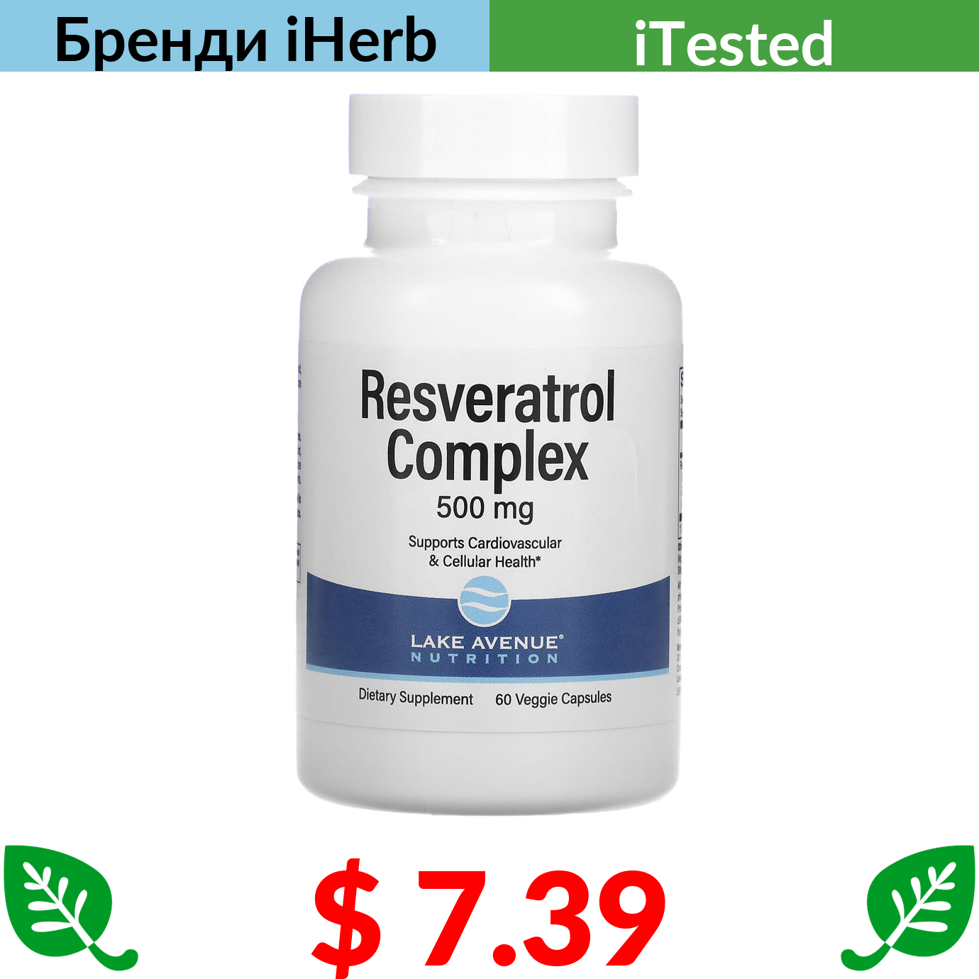 $ 7.39 Lake Avenue Nutrition, комплекс із ресвератролом, 500 мг, 60 капсул