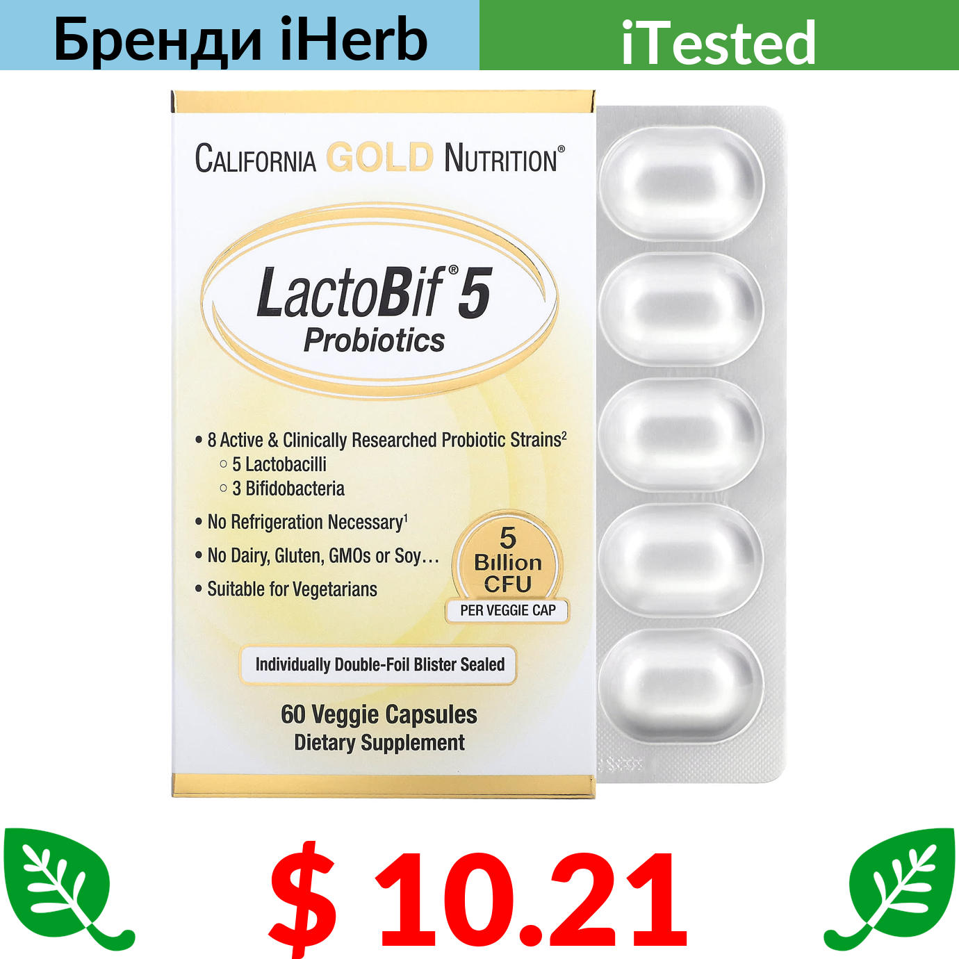 $ 10.21 California Gold Nutrition, LactoBif, пробіотики, 5 млрд КУО, 60 вегетаріанських капсул