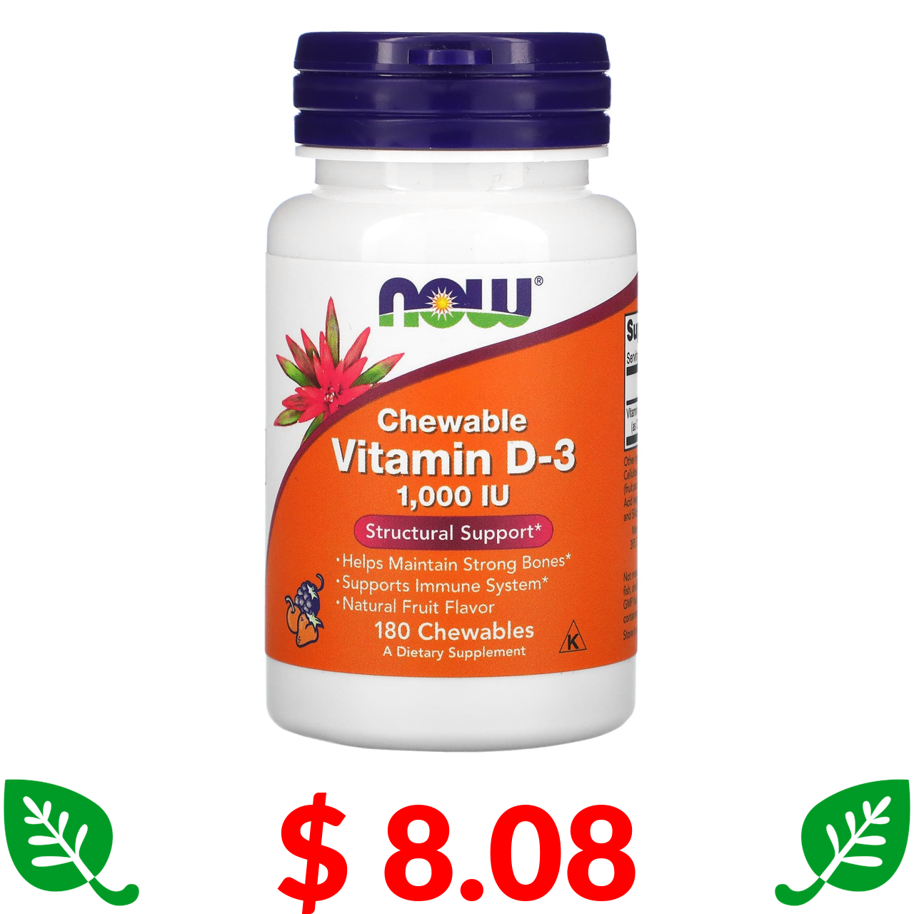 $ 8.08 Now Foods, жувальний вітамін D3, натуральний фруктовий смак, 1000 МО, 180 жувальних таблеток