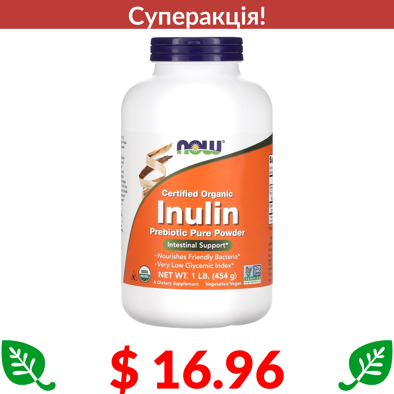 $ 16.96 Now Foods, сертифікований органічний інулін, порошок із чистого пребіотика, 454 г (1 унцій)