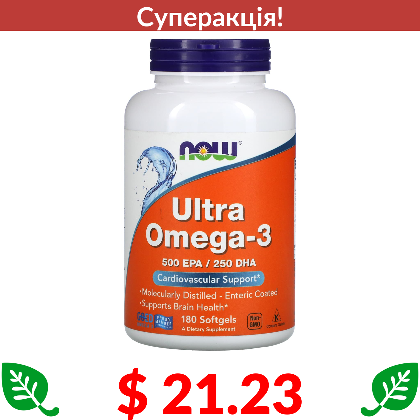 $ 21.23 Now Foods, Ultra Omega-3, 500 ЕПК / 250 ДГК, 180 капсул, вкритих кишковорозчинною оболонкою