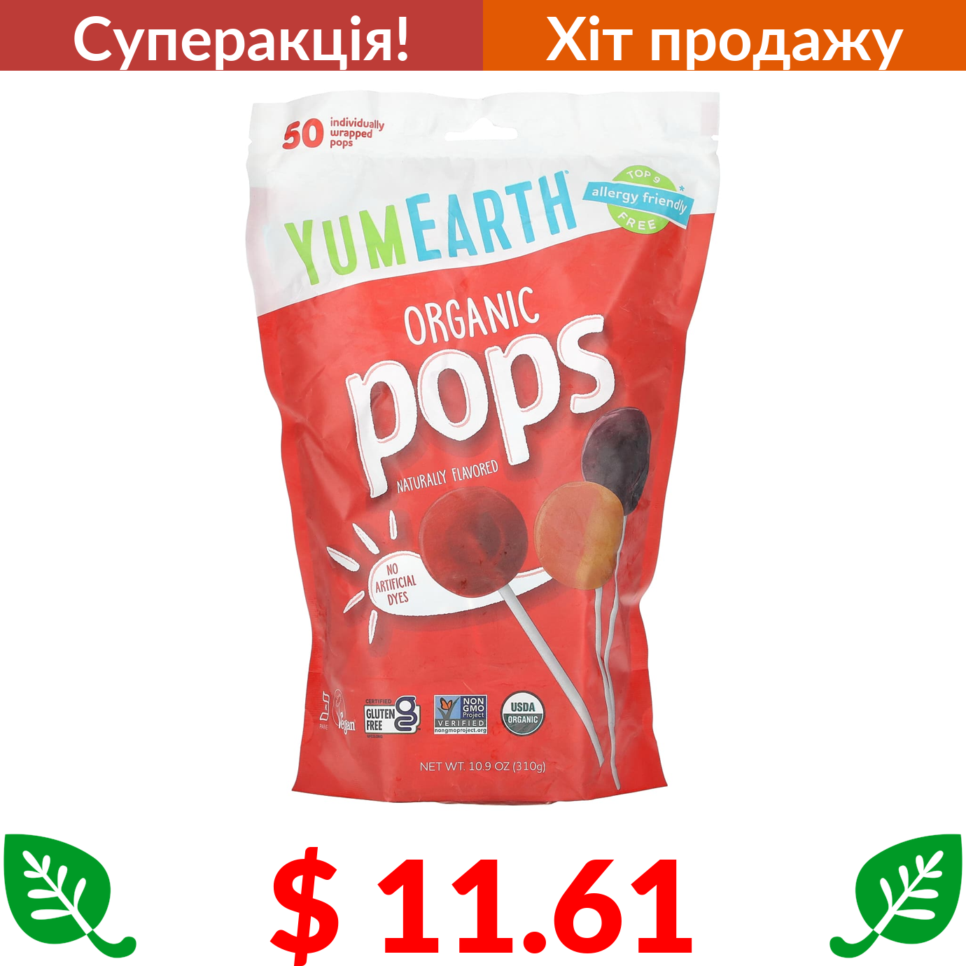 $ 11.61 YumEarth, органічні льодяники, асорті, 50 шт., 310 г (10,9 унції)