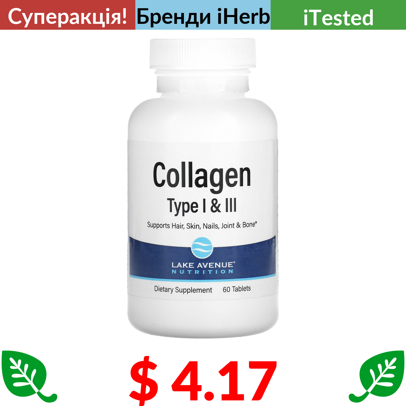 $ 4.17 Lake Avenue Nutrition, гідролізований колаген типів 1 і 3, 1000 мг, 60 таблеток
