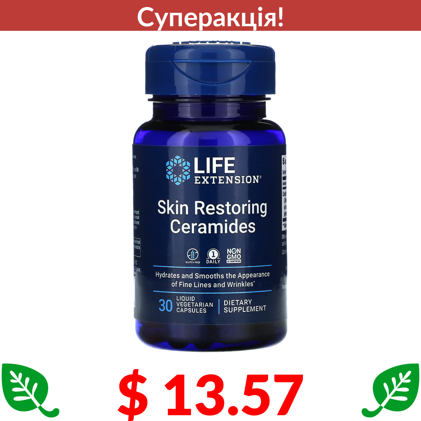 $ 13.57 Life Extension, кераміди для відновлення шкіри, 30 вегетаріанських капсул із рідким вмістом