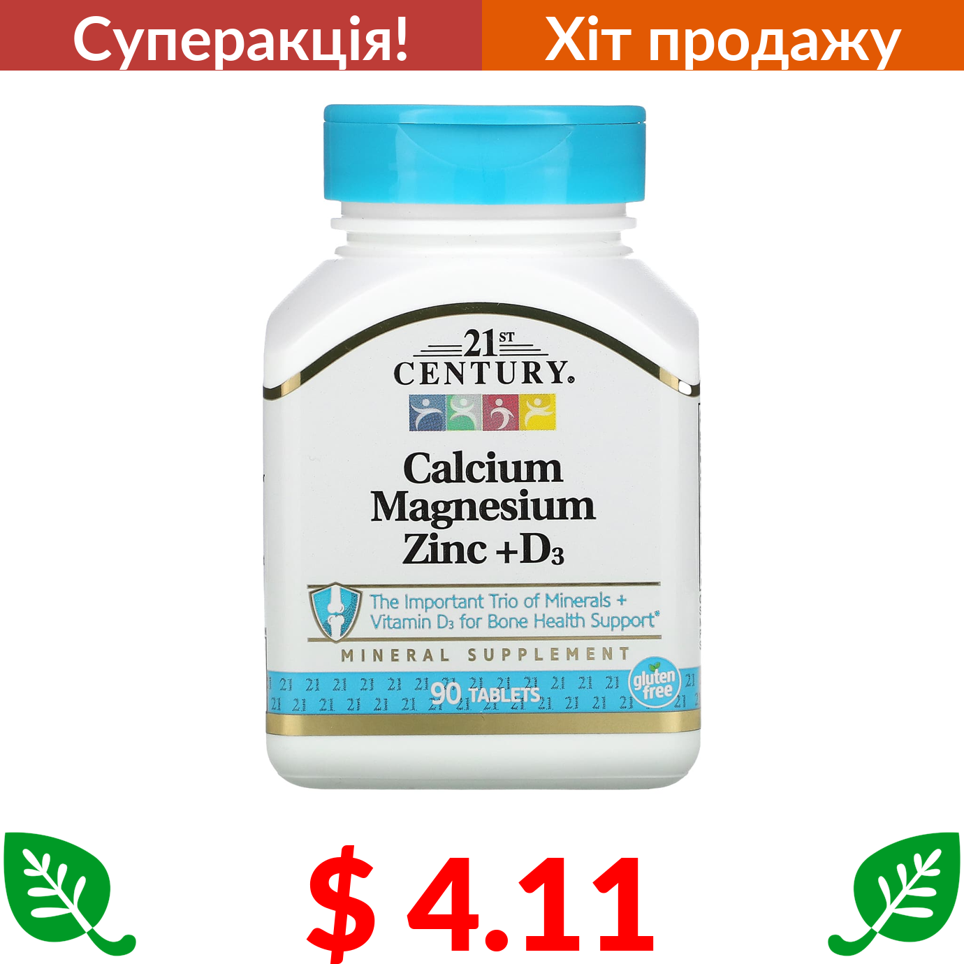 $ 4.11 21st Century, кальцій, магній, цинк і вітамін D3, 90 таблеток