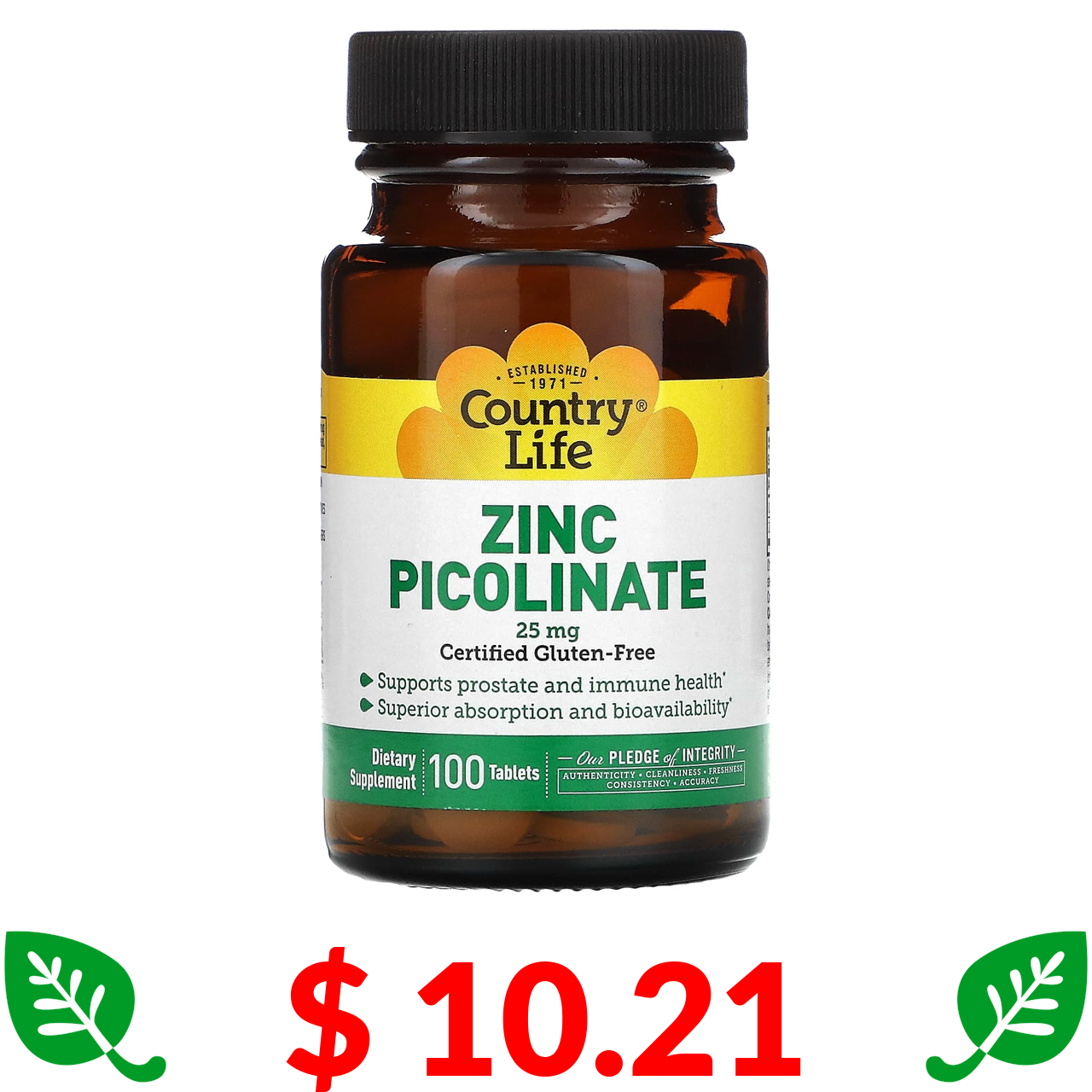 $ 10.21 Country Life, піколінат цинку, 25 мг, 100 таблеток