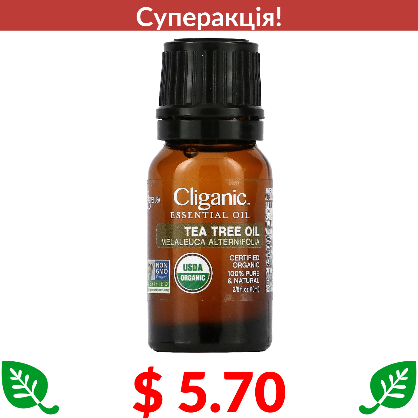 $ 5.70 Cliganic, 100% чиста ефірна олія чайного дерева, 0,33 рідкої унції (10 мл)