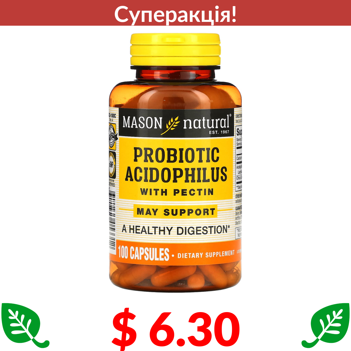 $ 6.30 Mason Natural, пробіотик з ацидофільними лактобактеріями Acidophilus і пектином, 100 капсул
