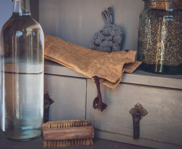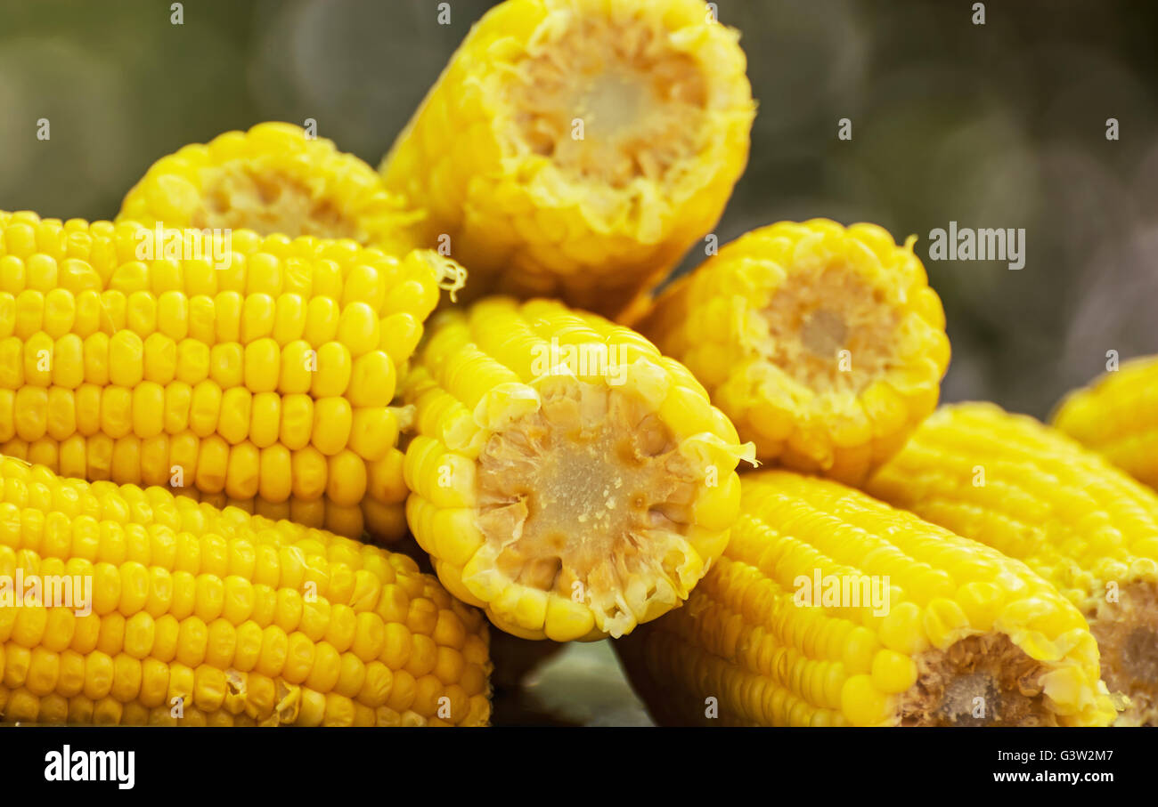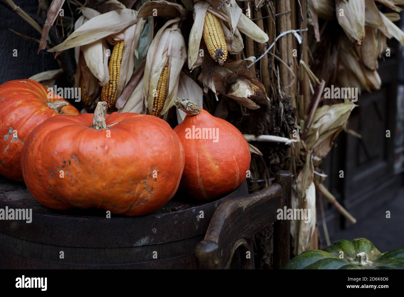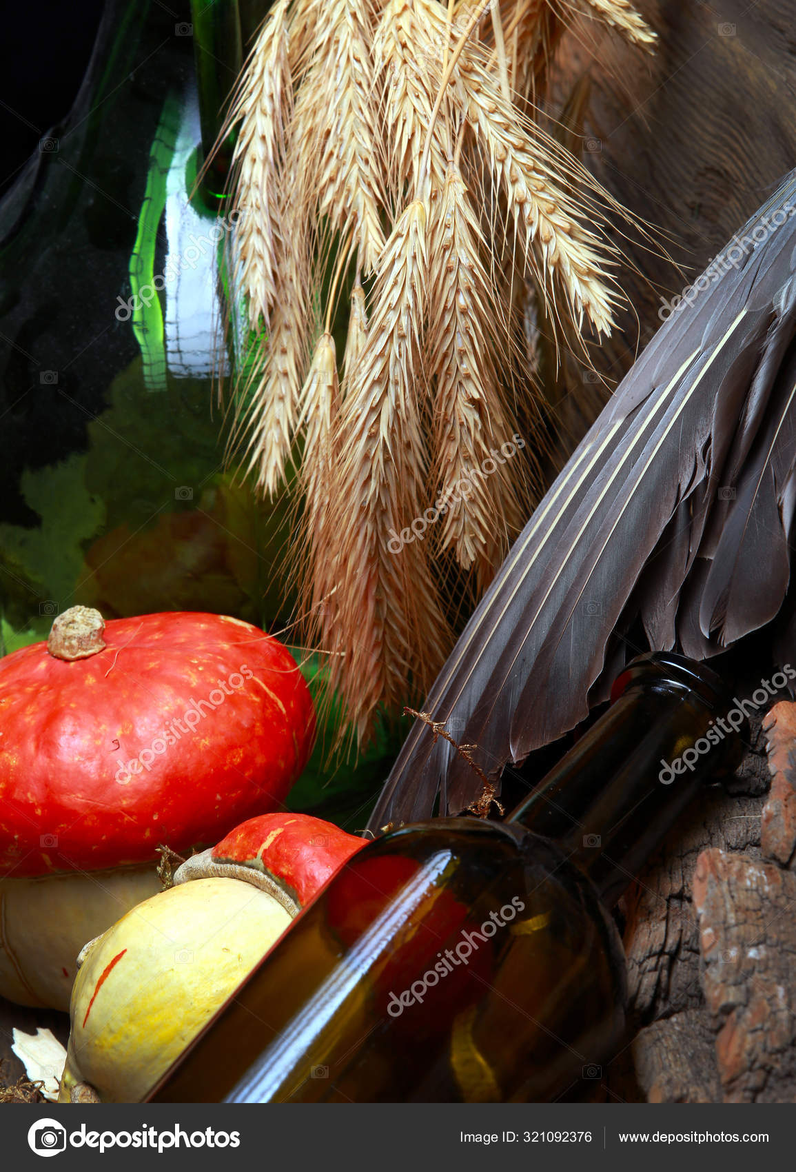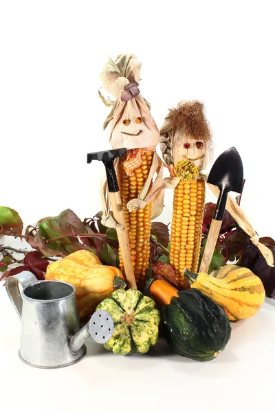 Épi de maïs, une bouteille et une citrouille