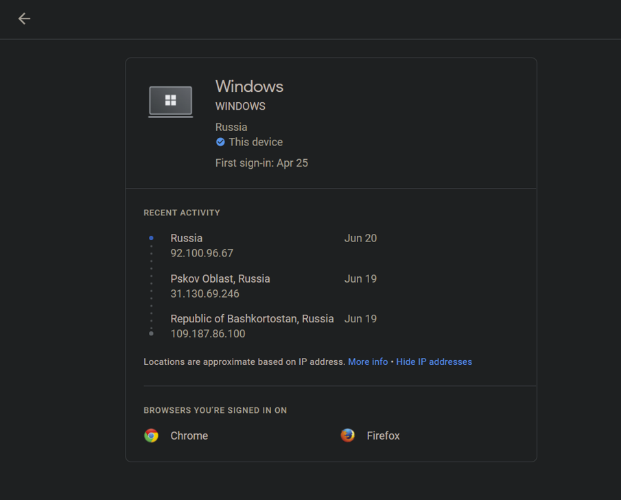 我去看了一下谷歌账号登录IP记录,均来自俄罗斯IP,